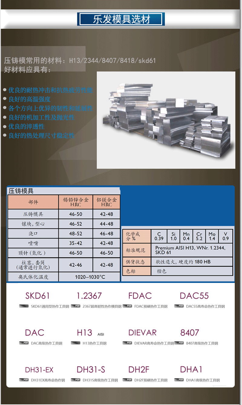 從以上得知,致使壓鑄模失效的主要形式是:①熱脹冷縮的交變應(yīng)力,長(zhǎng)期頻繁的反復(fù)循環(huán),在模具表面出現(xiàn)熱疲勞龜裂裂紋;②由于熱應(yīng)力及機(jī)械應(yīng)力引起的模具整體開裂、破損;③在壓射力和熱應(yīng)力的作用下,模具會(huì)在強(qiáng)度最薄弱處萌生裂紋,使型腔碎裂;④化學(xué)腐蝕、機(jī)械磨損、沖刷侵蝕、熔損侵蝕造成的模具侵蝕;⑤受到鎖模、插芯壓力和充填壓力作用使模具產(chǎn)生的塑性變形。這些模具失效缺陷出現(xiàn)的原因是復(fù)雜多樣的,下邊從實(shí)際應(yīng)用方面探討一些提高壓鑄模具壽命的具體措施。