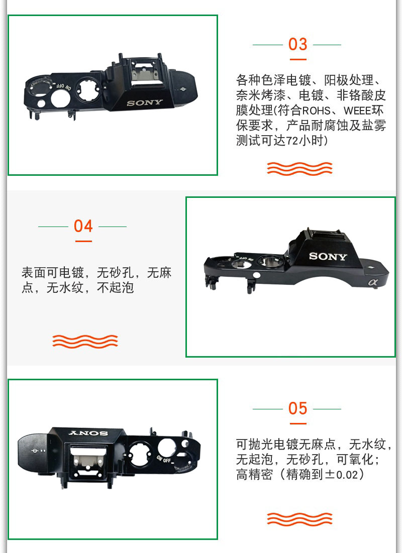 攝影器材配件攝影機保護殼經過壓鑄、拋光、氧化、電鍍等多道工藝制作而成。