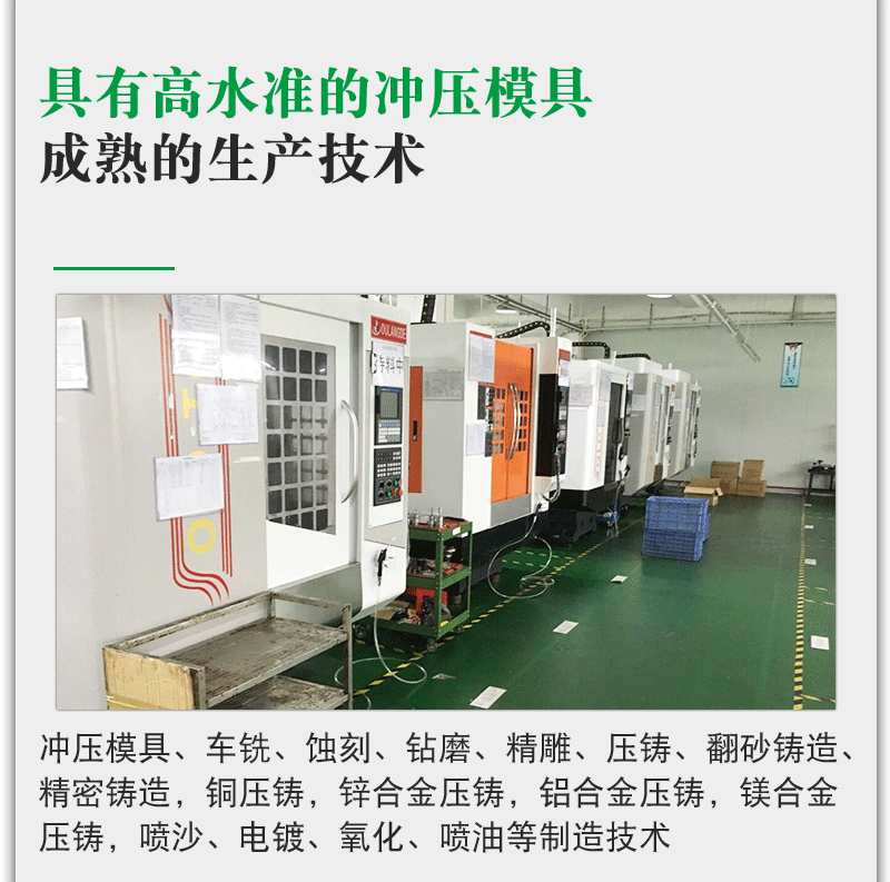 產(chǎn)品質(zhì)量優(yōu)勢(shì):壓鑄成品密度均勻,產(chǎn)品不易斷裂、變形、重量穩(wěn)定、表面均勻光滑,CNC加工、鑚孔攻牙、孔內(nèi)研磨、振動(dòng)研磨以及手工拋光研磨、各種色澤電鍍、陽極處理、奈米烤漆、電鍍、非鉻酸皮膜處理(符合ROHS、WEEE環(huán)保要求,產(chǎn)品耐腐蝕及中性鹽霧測(cè)試最高可達(dá)120小時(shí))表面可電鍍。